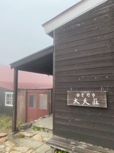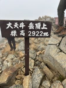 頂上到着しました。こう見えてガスってない、、、?いやめちゃくちゃガスってるだろ。前日の天気予報や気象図から察してはいましたが、この日は雨は降らないもののこの上なくガスっていてあまり天気に恵まれませんでした。幸い山頂でも電波がつながったので天気予報を見てみると、あら台風さんこんにちは。3日後に長野県直撃ではありませんか。ほんまに笑えない。ひとまず大天荘に戻り、今後どうするかをleaderさんが話し合っている間、身を寄せ合って寒さを凌ぎます。