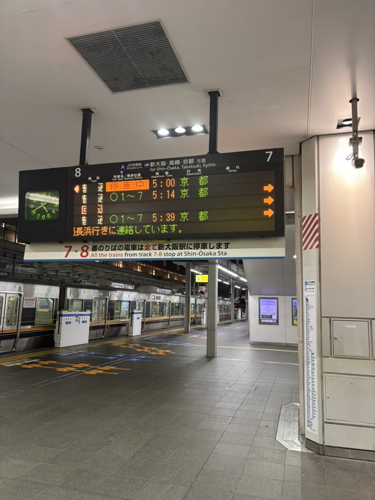 集合時間の松本駅11時30分集合に間に合わせるべく、大阪駅5時発の始発電車に乗車します。待ちに待った夏合宿を目前に、舞い上がっていた僕は4時20分ごろに大阪駅に到着しました。