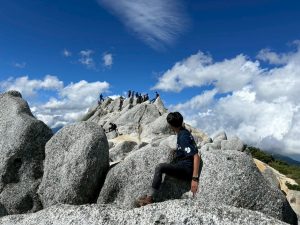 ピストン装ならではの苦戦を強いられつつも30分ほどで燕岳山頂到着しました。19人で山頂に押し寄せたものですから、一般の方が気を使ってどいてくださいました。誠に申し訳ございません。山頂は10数分ではあるものの、我々の部員でハイジャック状態になってしまいました。正直あまりよろしくないですね、とっとと山荘に戻りましょう。