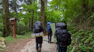 ひたすら登りです。この日の行動時間はコースタイム4時間弱でしたが、暑さも相まって疲労はそれ以上でした。特に70期にとっては初めての錬成合宿で歩荷も増えたことで、精神的にも体力的にもかなり疲弊しているのではないかと、先頭を歩きながら耳を欹てて彼らの会話を聞いていました。ところが意外にも彼らの会話は呼び名の話や地元の自虐などで盛り上がっており、新入生の体力に感心するばかりでした。19人もいる70期は、お互いのことを知るのに新歓合宿だけでは物足りなかったみたいです、笑