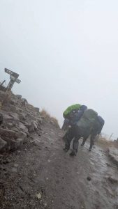 そのまま何とか進むと、すがもり越の辺りで斜め下方向から体が軽くのけぞらされるほどの風が吹き付けました。顔に当たる雨はさながら砂粒のような様相でした。ぬかるんだ火山灰土にはとにかく足を取られるし、めっちゃ滑ります。霧で視界も悪く、50m先が全く見えない状況なので、印を頼りに進みました。