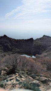 の隣には巨大なすり鉢状の地形が。これが多分火口なんだろうと思いながら急登を下ります。おとといの寒さは見る影もなく暖かくなり、霜が解けてだんだんと道がぬかるんでいます。向かって左側をみると昨日巡り歩いたピークが見え、この合宿も終わりに差し掛かっていると感じさせます。
