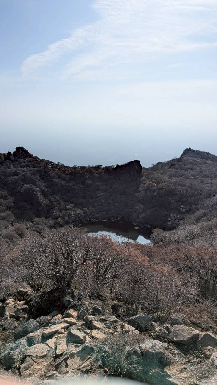 なぜか27kgを持ったままピストンするという虚無行程を2回こなし、次々にピークを踏んでいきます。霧はいつの間にか晴れ、火山らしい大きなハゲ山と青空が姿を現しました。火山であり山脈ではないので山域がとても狭く、すぐ下に田園風景が見えます。空中に浮いた島を歩いているような感じがします。空気も澄み、後ろのパーティに見つかる度にやまびこが響いてました。